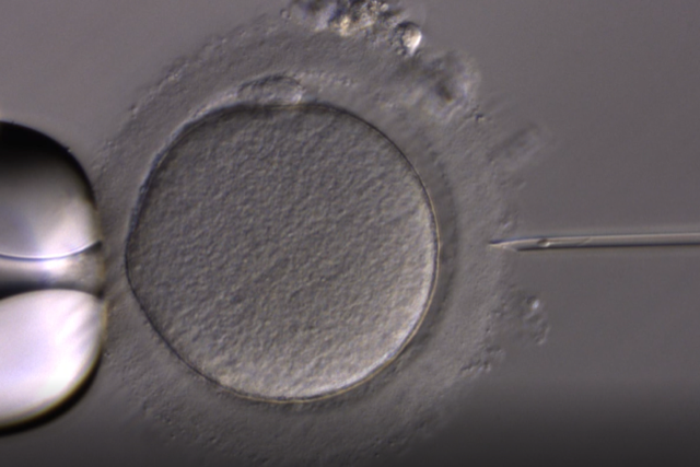 ▲顕微授精:細い針の中に精子が入っています。この針を卵子に穿刺し、精子を注入します。
